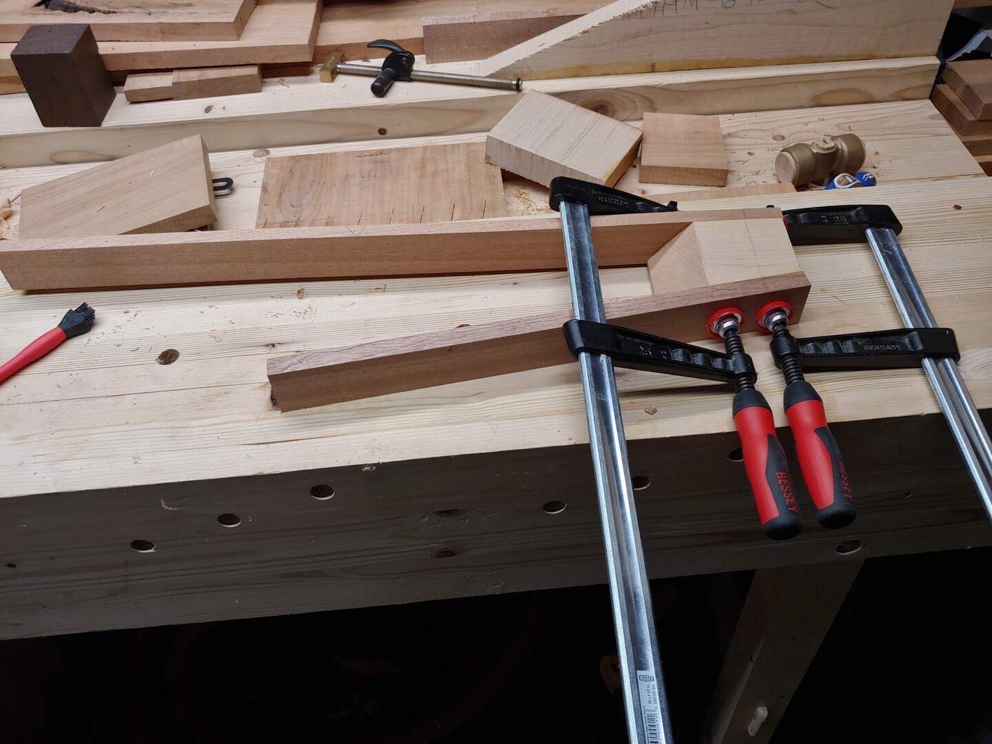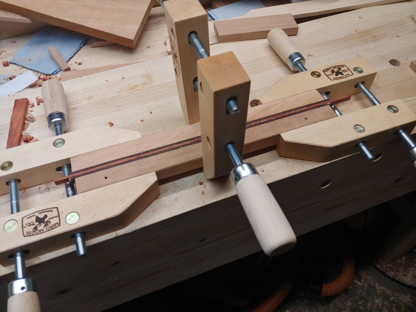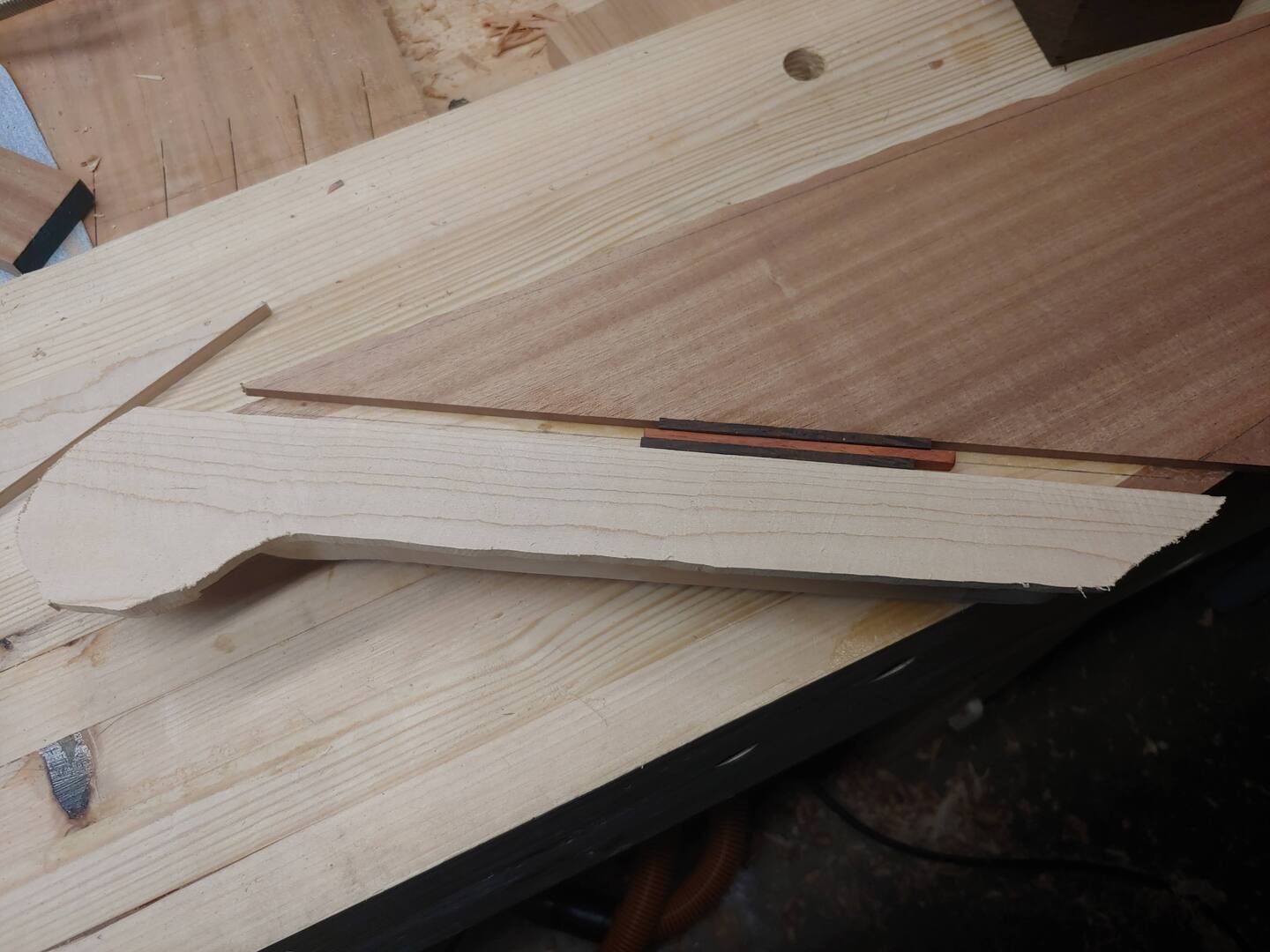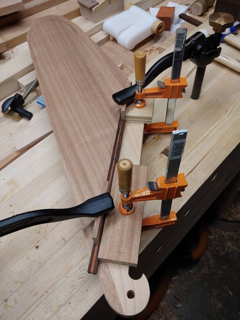 I wanted to add some accent between the soundboard and the maple head, so I made some strips of wood from bloodwood and wenge. The red and dark colors complement the otherwise fairly light instrument very nicely.