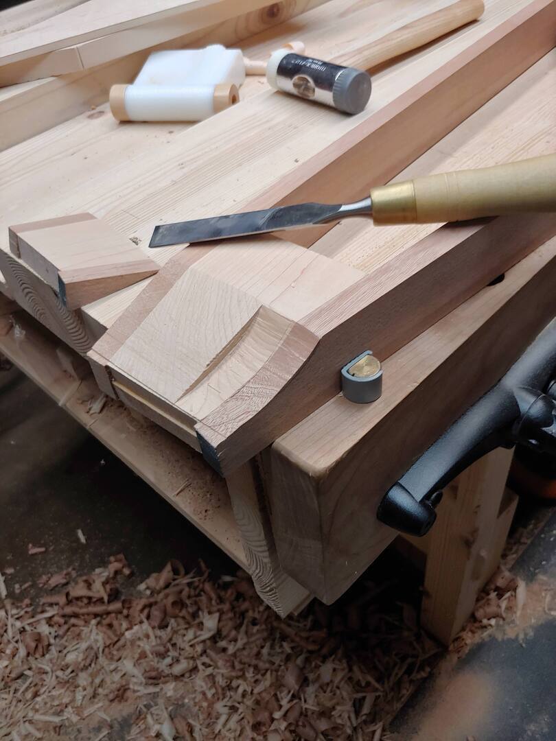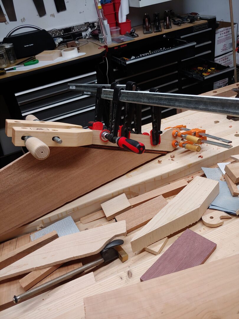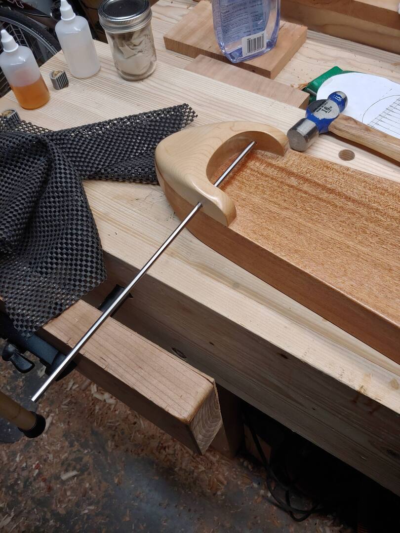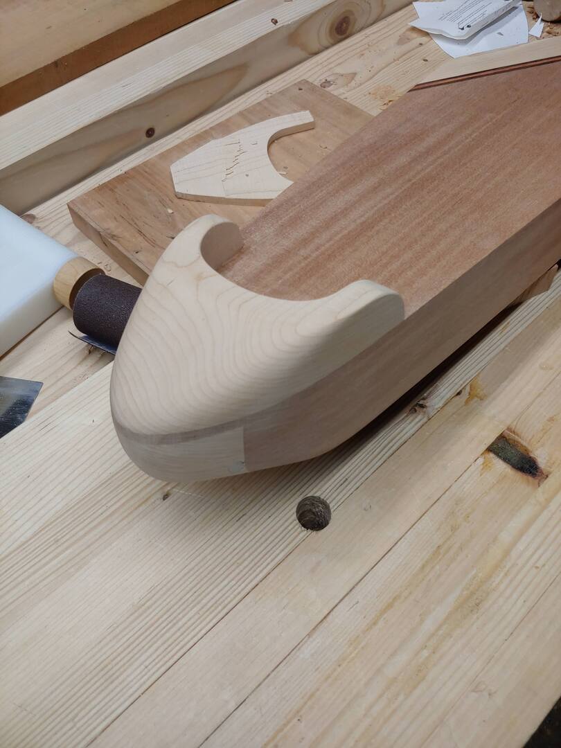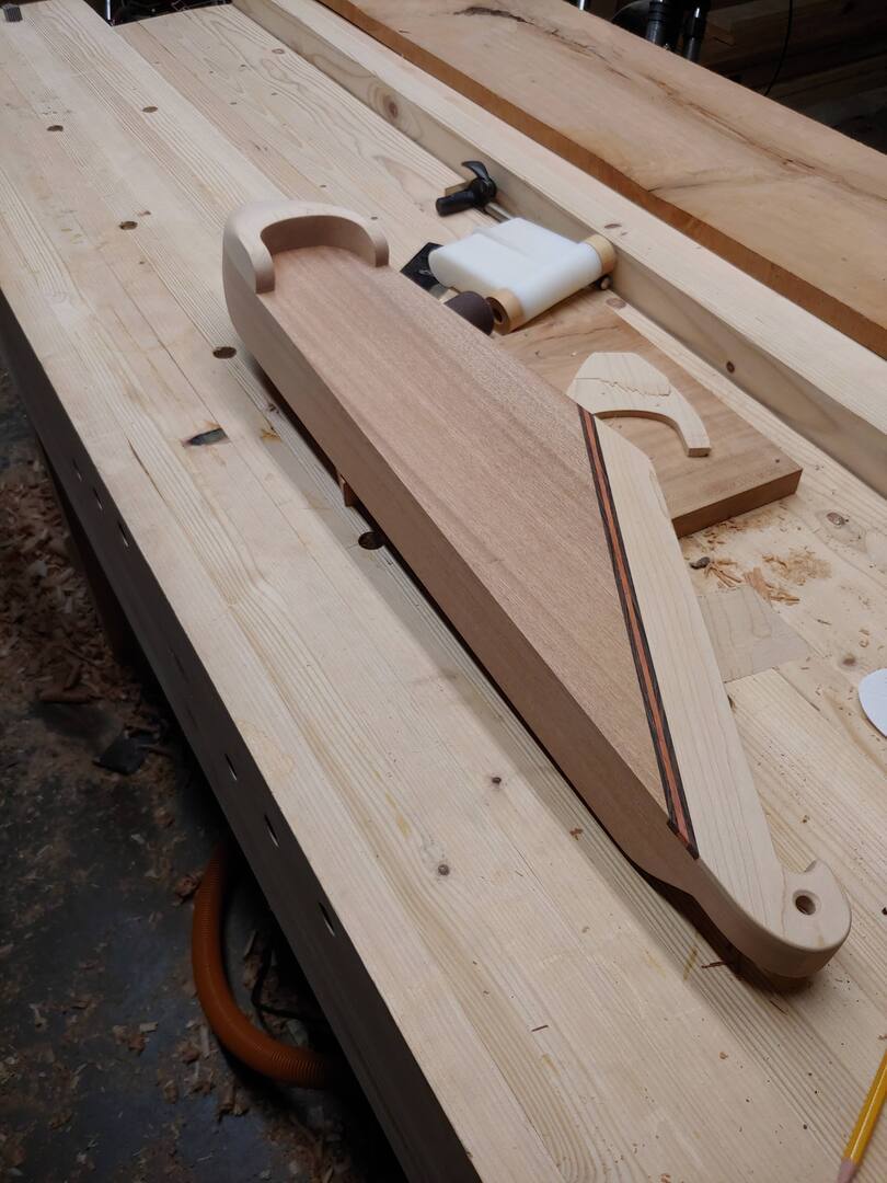 When gluing the frame, I inserted a few dowels between the maple and the sapele sides to stop movement during gluing. I added an additional piece of sapele on the bottom of the maple head to complete the frame, and then did shaping using chisels, gouges, rasps and files to finish off the shape of the frame.